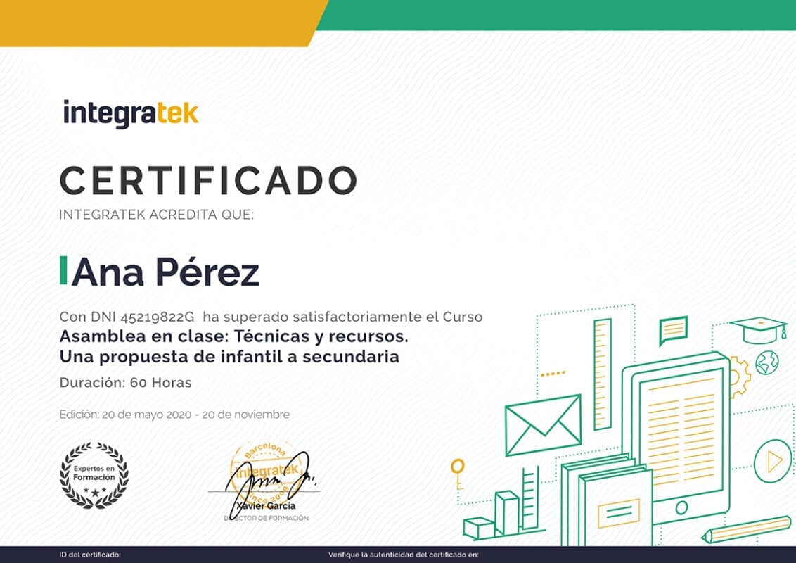 De tota manera, si el curs no està reconegut per la Conselleria d’Educació de la vostra comunitat us lliurarem igualment un certificat propi d’Integratek perquè pugueu adjuntar-lo al vostre currículum formatiu.